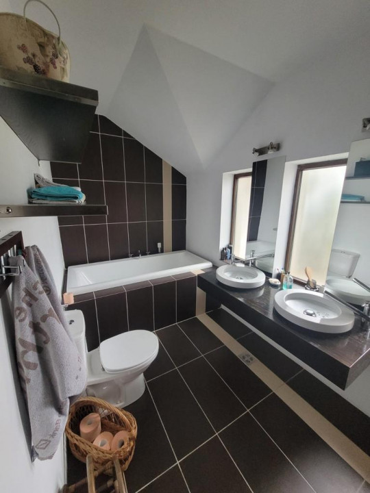 Facilități casa: cărămidă Porotherm, țiglă Bramac, izolație interioară și exterioară, tâmplărie PVC, ușă de intrare din lemn stratificat, uși interioare furniruite, rulouri exterioare, parchet, gresie și instalații sanitare de calitate superioară, căzi Laufen, centrală tip boiler Radiant, instalații termice, electrice și cablu în perete, aer condiționat etaj, hotă tubulară Franke și masă insulară bucătărie, chiuvetă granit, Velux etaj, iluminat exterior.
